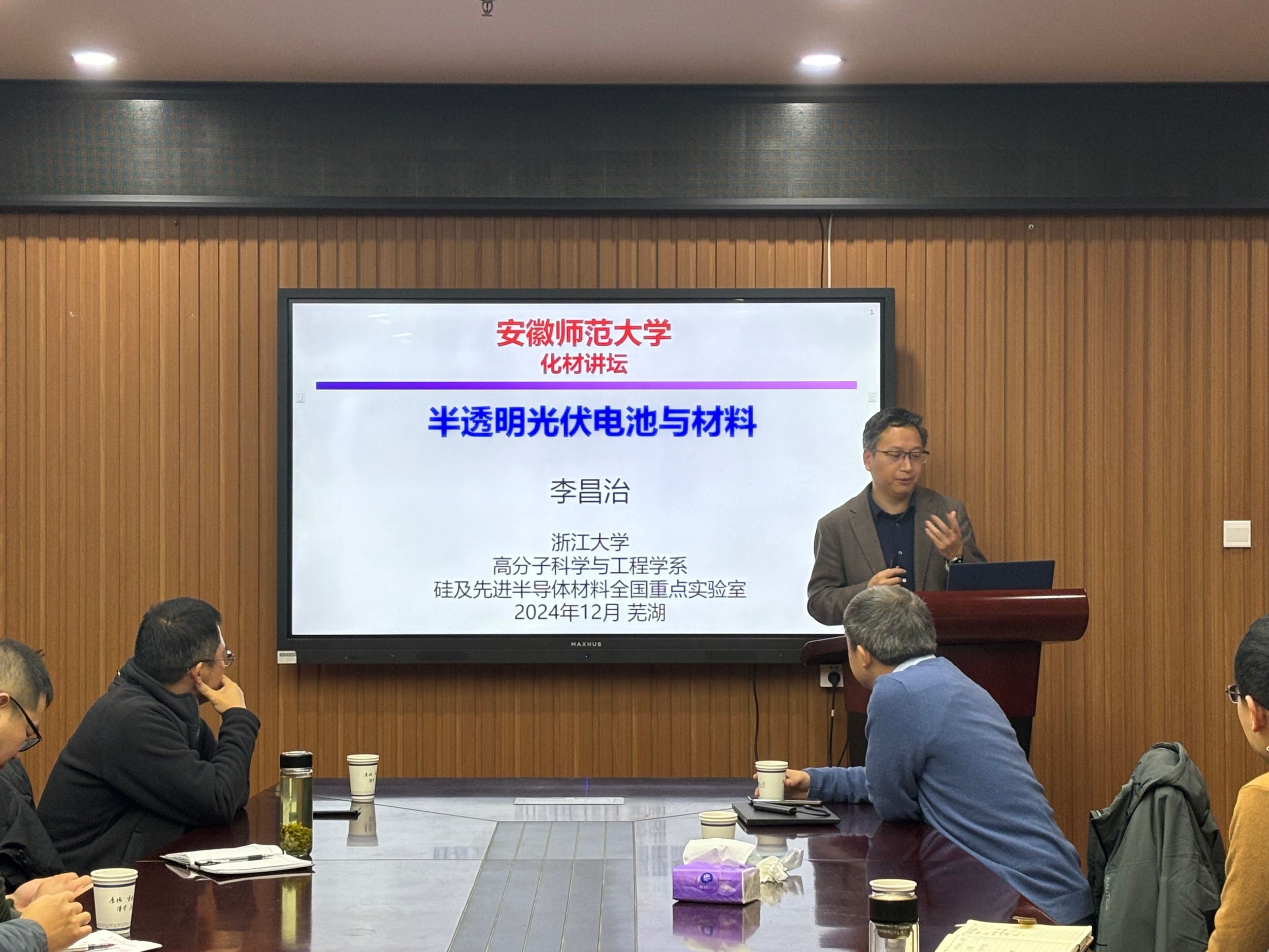 李昌治教授作了题为“半透明光伏电池材料”的学术报告。李昌治教授首先介绍了半透明光伏电池的基本原理和应用前景,随后详细阐述了在材料设计、制备工艺以及性能优化方面的最新研究成果。李教授特别强调了提高光伏电池效率和稳定性的关键技术,以及如何通过材料创新来实现这一目标。李教授还分享了自己在有机光伏小组件认证效率纪录上的连续突破,以及在《太阳能电池效率表》中的收录情况。此外,李教授还展示了其团队在制备认证效率高达26.09%的反型钙钛矿太阳电池方面的成就,并介绍了新型透明光伏建筑一体化技术及应用产品的研发进展。会后,李昌治教授与与会师生就报告内容展开了一系列讨论,并回答了与会师生提出的问题。